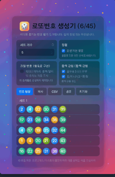 이번 주 로또 1194회(2025년 10월 18일 추첨)를 위한 데이터 분석을 정리했습니다. 지난 회차에서는 10, 16, 23, 36, 39, 40 + 11이 당첨되며, 고숫자 비중이 높았고 연속수(39·40)가 등장했습니다. 이번 주 역시 최근 100회 데이터를 기반으로 홀짝·고저·합계 패턴을 살펴보고, 재미로 볼 수 있는 추천 번호 세트를 준비했습니다. 본 글은 어디까지나 참고용이며, 실제 당첨을 보장하지 않습니다.